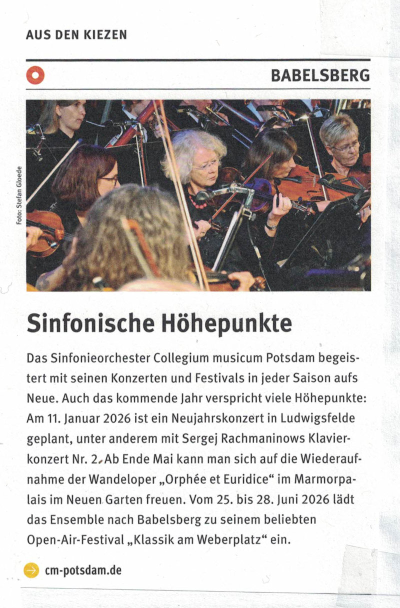 An dieser Stelle steht oft Kritik, heute aber ein Dank. Und zwar an jene ehrenamtlichen Musikerinnen und Musiker des Sinfonieorchesters Collegium musicum Potsdam, die den BabelsbergerWeberplatz am Samstagabend gerockt haben – und zwar mit Violinen, Klarinetten, Flöten, einem Schlagzeug und auch Gitarren.
